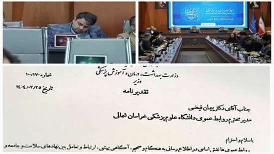 در پایان، دکتر پیمان فیضی مدیر روابط عمومی دانشگاه علوم پزشکی خراسان شمالی لوح تقدیر خود را از وزیر بهداشت دریافت کرد.