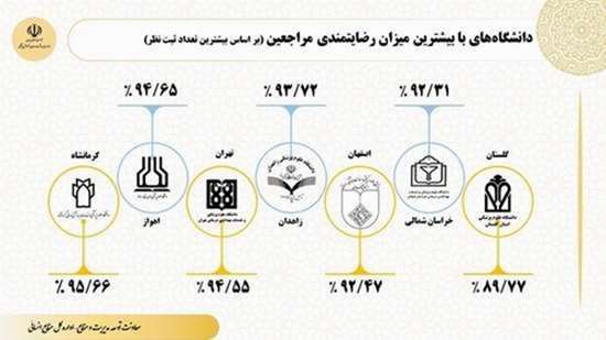 وی افزود: دانشگاه علوم پزشکی اهواز با ۹۴.۶۵ درصد، دانشگاه علوم پزشکی تهران با ۹۴.۵۵ درصد، دانشگاه علوم پزشکی زاهدان با ۹۳.۷۲ درصد، دانشگاه علوم پزشکی اصفهان با ۹۲.۴۷ درصد، دانشگاه علوم پزشکی خراسان شمالی با ۹۲.۳۱ درصد و دانشگاه علوم پزشکی گلستان با ۸۹.۷۷ درصد، 5 دانشگاه برتر اعلامی از سوی وزارت بهداشت هستند.